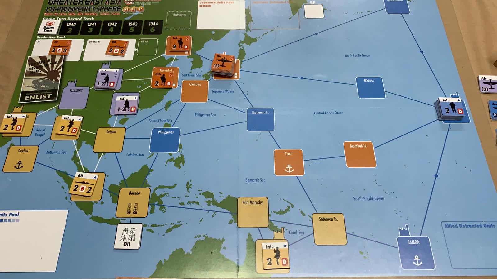 1941年,日本決定派遠征軍攻打蘇聯的海參威,遊戲中叫符拉迪沃斯托克,打出一張指定卡牌執行,同時試過派戰機轟炸桂陽,將國軍打殘,但轉頭便被對方打出手牌重整軍力,於是又派部隊攻打重慶,成功佔領重慶,看來蔣公又要搬家了。而美國就部署一支龐大艦隊由珍珠港移動到中途島,下一步會是搶先宣戰,劍指日本本土嗎?
