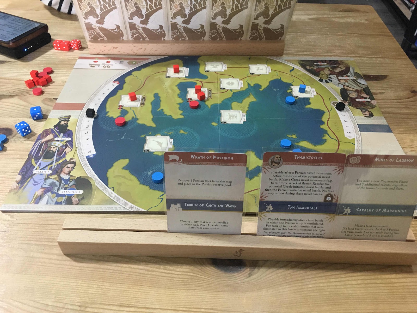 其中一戰,波斯沒有在首回合造浮橋,只在本土增兵和買牌,希臘只買了兩張手牌,剛好有「三列槳座戰船」,可以移動兩次海軍,於是購買兩艘戰船,主動進攻波斯本土,發動海戰,最終癱瘓了波斯行動,達到不錯戰略效果。